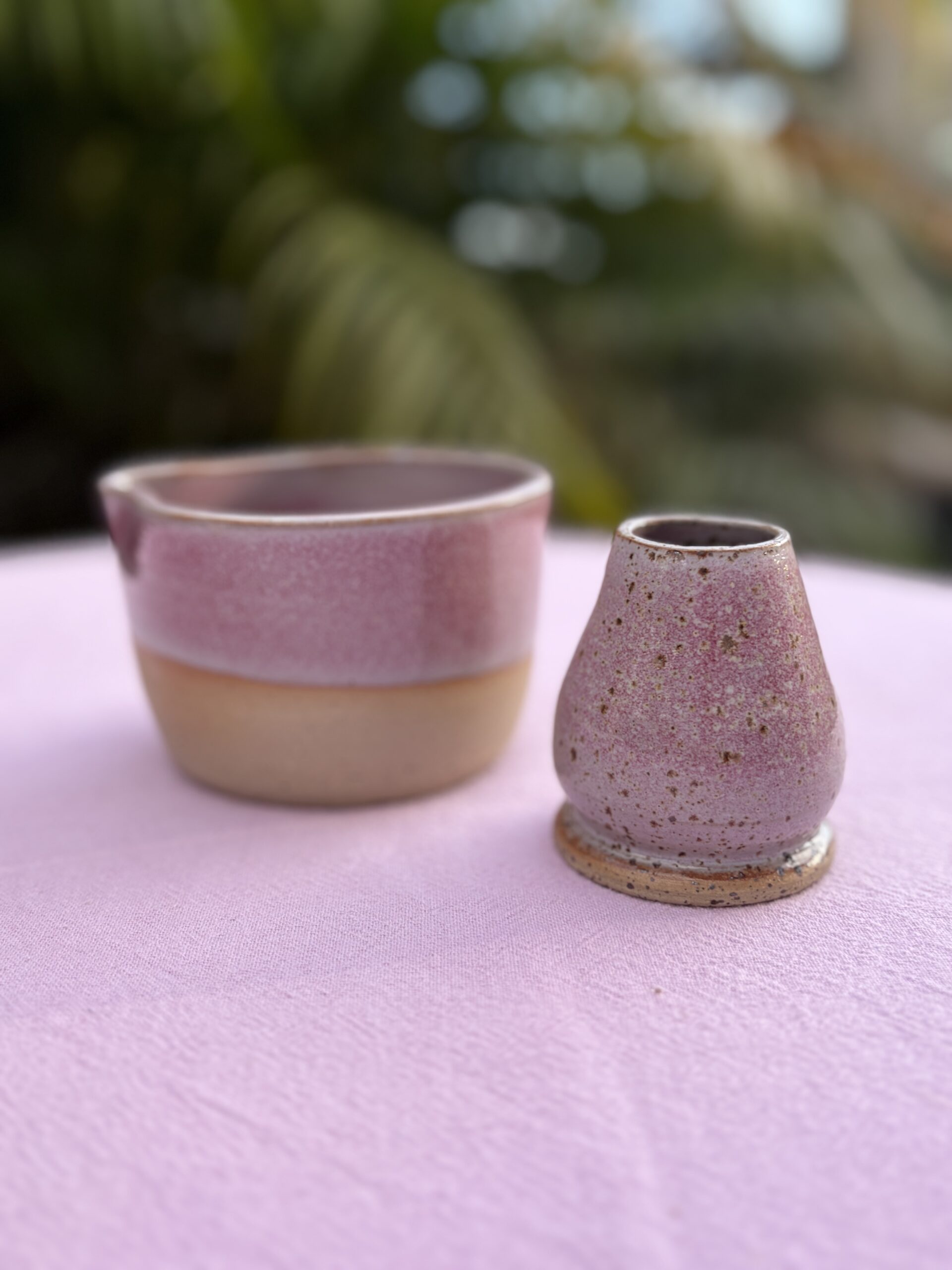 Ce set matcha est composé d’un chawan à bec, bol de cérémonie et d’un naoshi coordonné.  Le chawan présente une base brute, ocre et une partie supérieure émaillée de nuances de rose.  Le naoshi (repose-fouet) est  émaillé avec des nuances de rose tacheté sur toute sa surface.