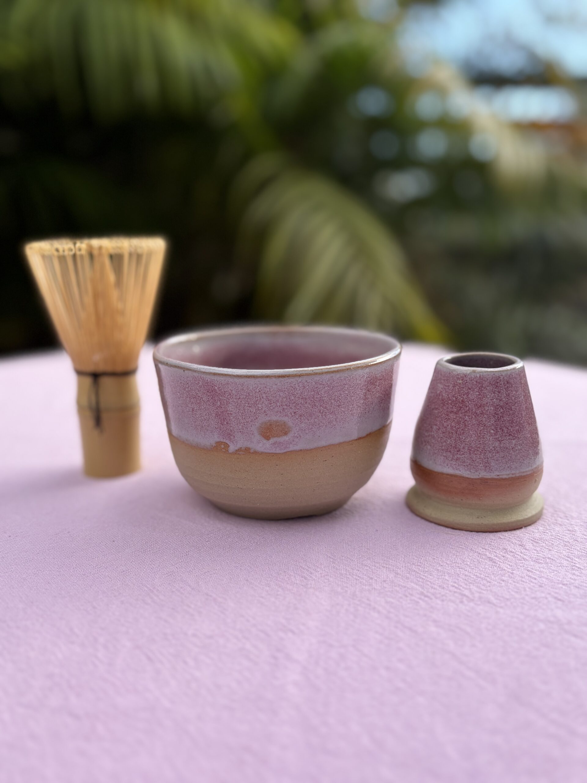 Ce set matcha est composé d’un chawan, bol de cérémonie et d’un naoshi coordonné. Le bol présente une base brute, non-émaillée et une partie supérieure émaillée laissant apparaitre des taches brune et des taches roses. Le naoshi (repose-fouet) présente une base brute de couleur ocre et une grande surface émaillée majoritairement rose foncé.