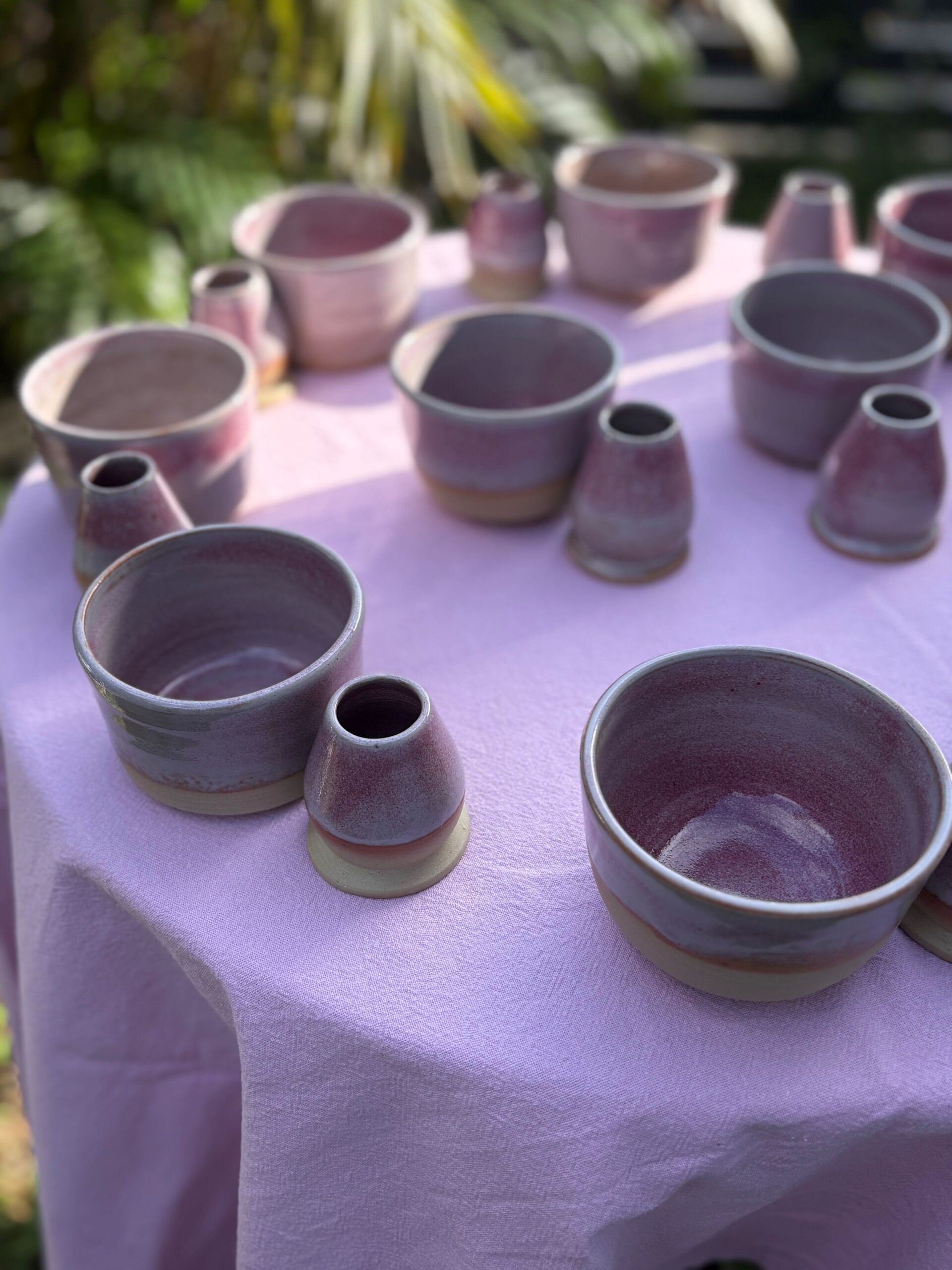 Chaque set est absolument unique : variations de teintes, irrégularités maîtrisées, touches d’émail singulières… autant de marques qui témoignent de la main de l’artisane et de la qualité d’un travail fait avec soin, patience et passion.